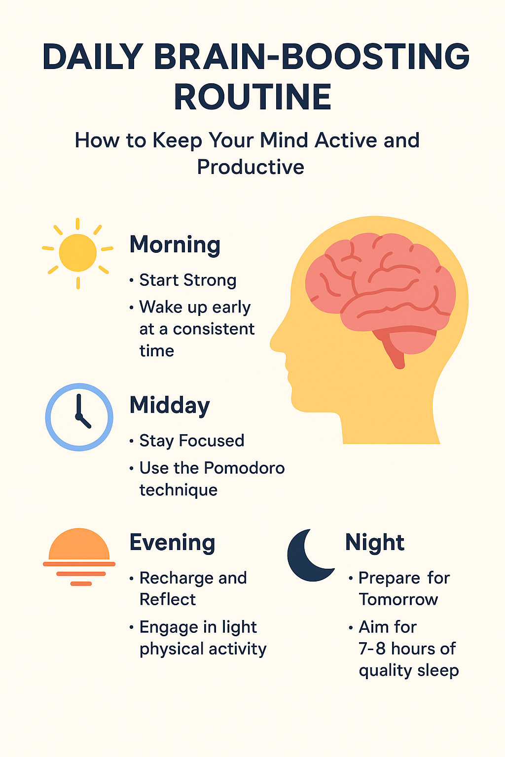 - Hydrate first thing with 1–2 glasses of water to fuel your brain.